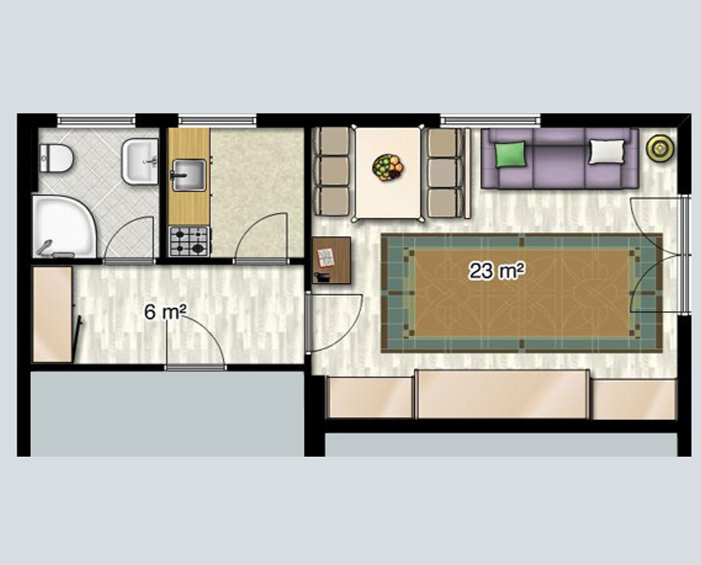 • Wohn-Schlafraum: gemütlicher Raum mit Ausklapp-Doppelbett